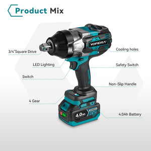 4.0Ah High-Capacity Battery: Equipped with a 4.0Ah lithium-ion battery, this cordless impact wrench ensures extended runtime and efficient performance, allowing you to work longer without interruption. Plus, the quick charge feature means you won't be left waiting.