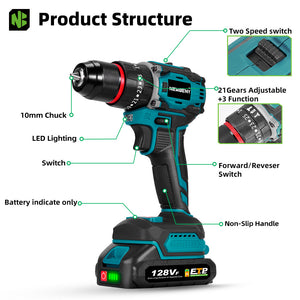 NewBeny Brushless Cordless Drill Kit – 2 Batteries, 30 Accessories, Charger & Case