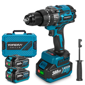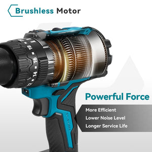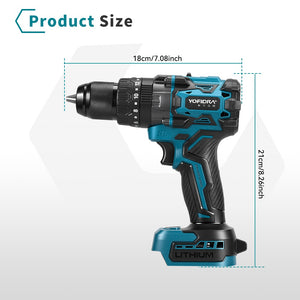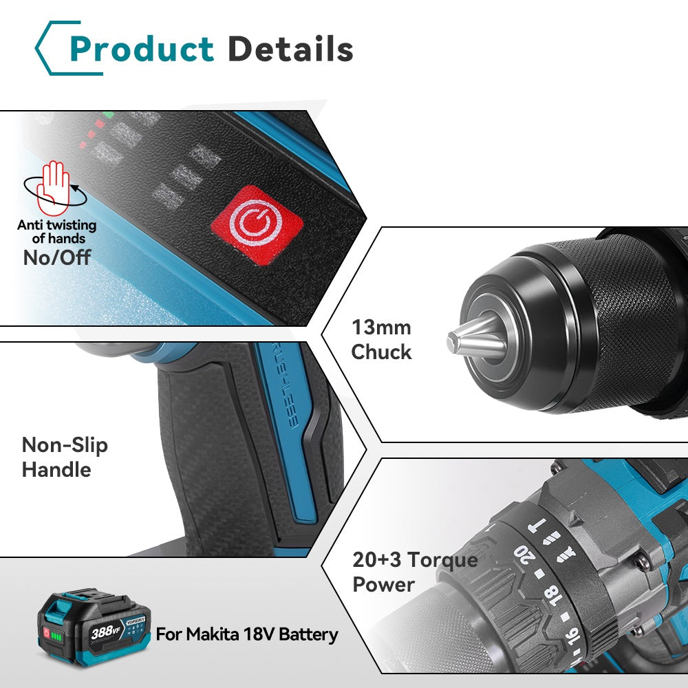 Versatile 13mm Chuck & Multi-Function Design – One tool for multiple needs. With a 13mm keyless chuck and functions for impact, screwdriving, and drilling, this heavy-duty cordless drill is designed for wood, metal, concrete, and more.