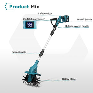 The integrated digital power display shows remaining battery life and working status clearly, helping you plan your gardening tasks without interruption. A must-have for anyone using a cordless garden cultivator.