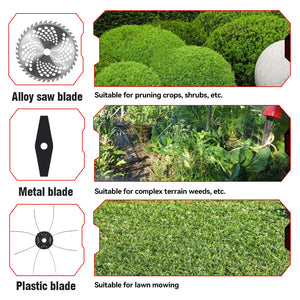 Equipado con una hoja de aleación circular de 250mm (10 pulgadas), está listo para enfrentar trabajos de corte difíciles con facilidad. El paquete también incluye una hoja de metal de 3 dientes para hierba alta y una cabeza de recortadora de nylon para eliminar malezas, lo que lo hace ideal para diversas tareas de recorte en tu jardín. -
