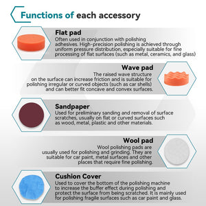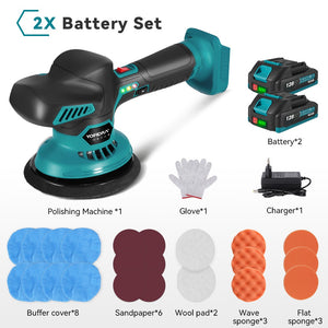 Kit Portátil Todo en Uno: Lleva tu pulido a cualquier lugar con este conveniente set de pulidor de coche inalámbrico. Viene completo con la máquina, 2 baterías recargables, 1 cargador y una gama completa de accesorios, incluyendo 3 pads de espuma de onda, 3 pads de espuma plana, 6 papeles de lija, 8 cubiertas de pulido, 2 pads de lana y 1 par de guantes—todo lo que necesitas para pulir, abrillantar y terminar sobre la marcha.