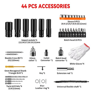 Perçage et conversions : Livré avec 4 forets hélicoïdaux (3 mm, 4 mm, 5 mm, 6 mm) et un foret triangulaire à tige hexagonale de 6 mm, vous assurant d'être équipé pour les tâches de perçage et de fixation. Comprend une pince de serrage et des convertisseurs de tête pour une transition fluide entre les outils.