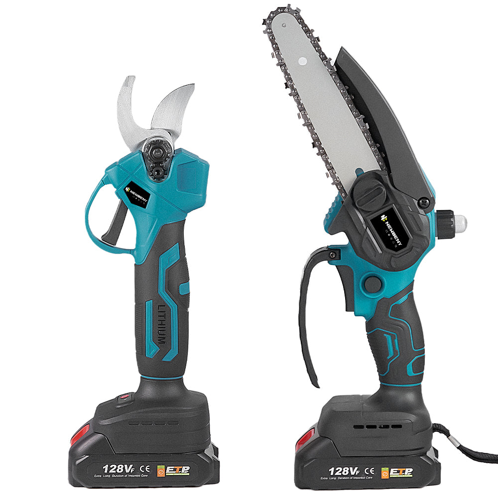 Battery-powered pruning tool and chainsaw kit ideal for home gardening
