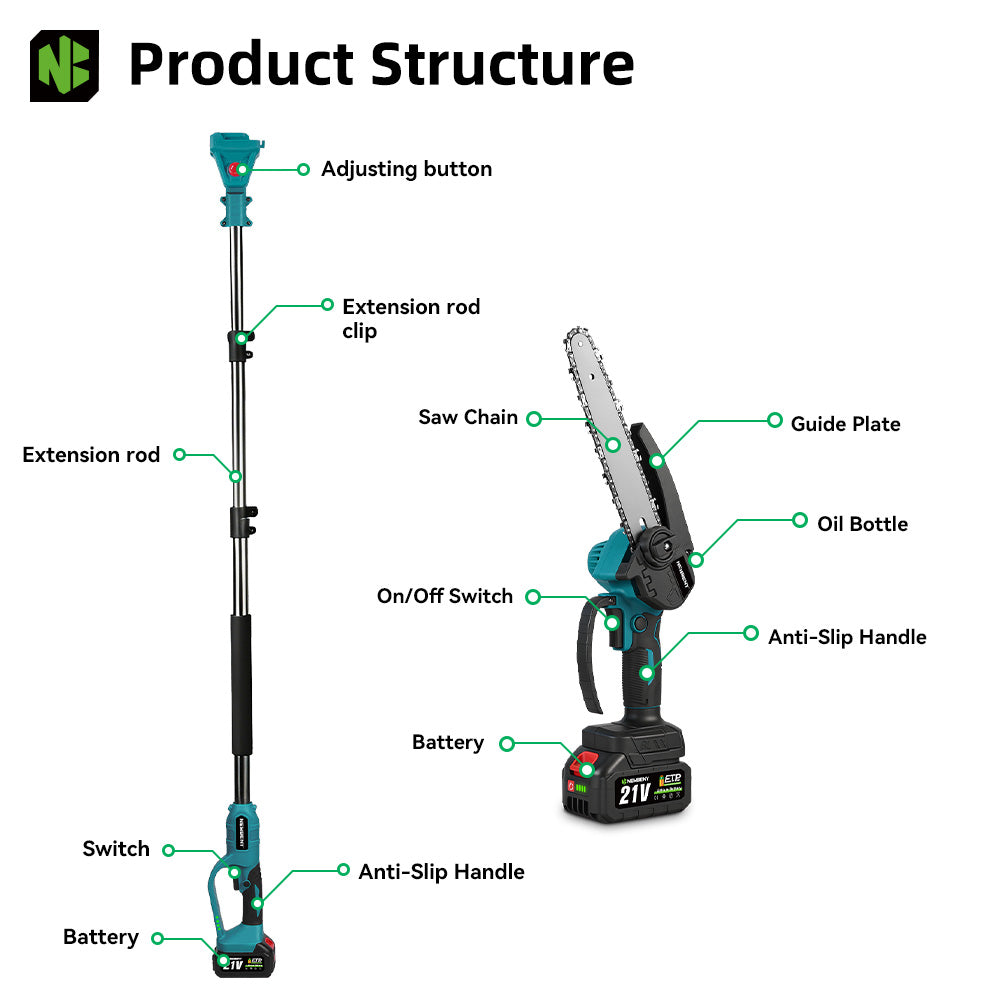 Scie à perche sans fil NewBeny 8 pouces avec rallonge télescopique de 2 m [2 batteries et un chargeur inclus]