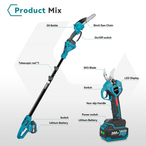 NewBeny Cordless 8" Chainsaw & 32mm Pruning Shears & 1.7m High Pole Combo Kit With 2 Batteries and Charger