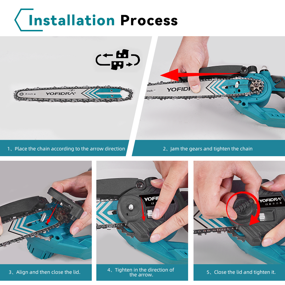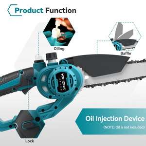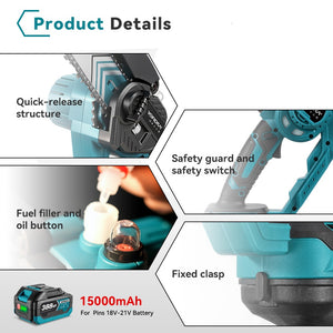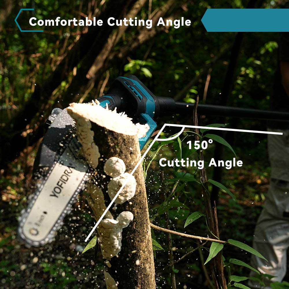 The 150-degree rotatable head adapts to tricky angles, making it easier to cut in tight spaces. Equipped with a built-in oil tank and one-press lubrication system, the chain stays sharp and smooth with minimal maintenance.